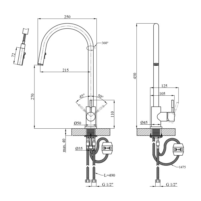 Змішувач для кухні з висувним виливом Kroner KRP Edelstahl Klassisch - SCH03915